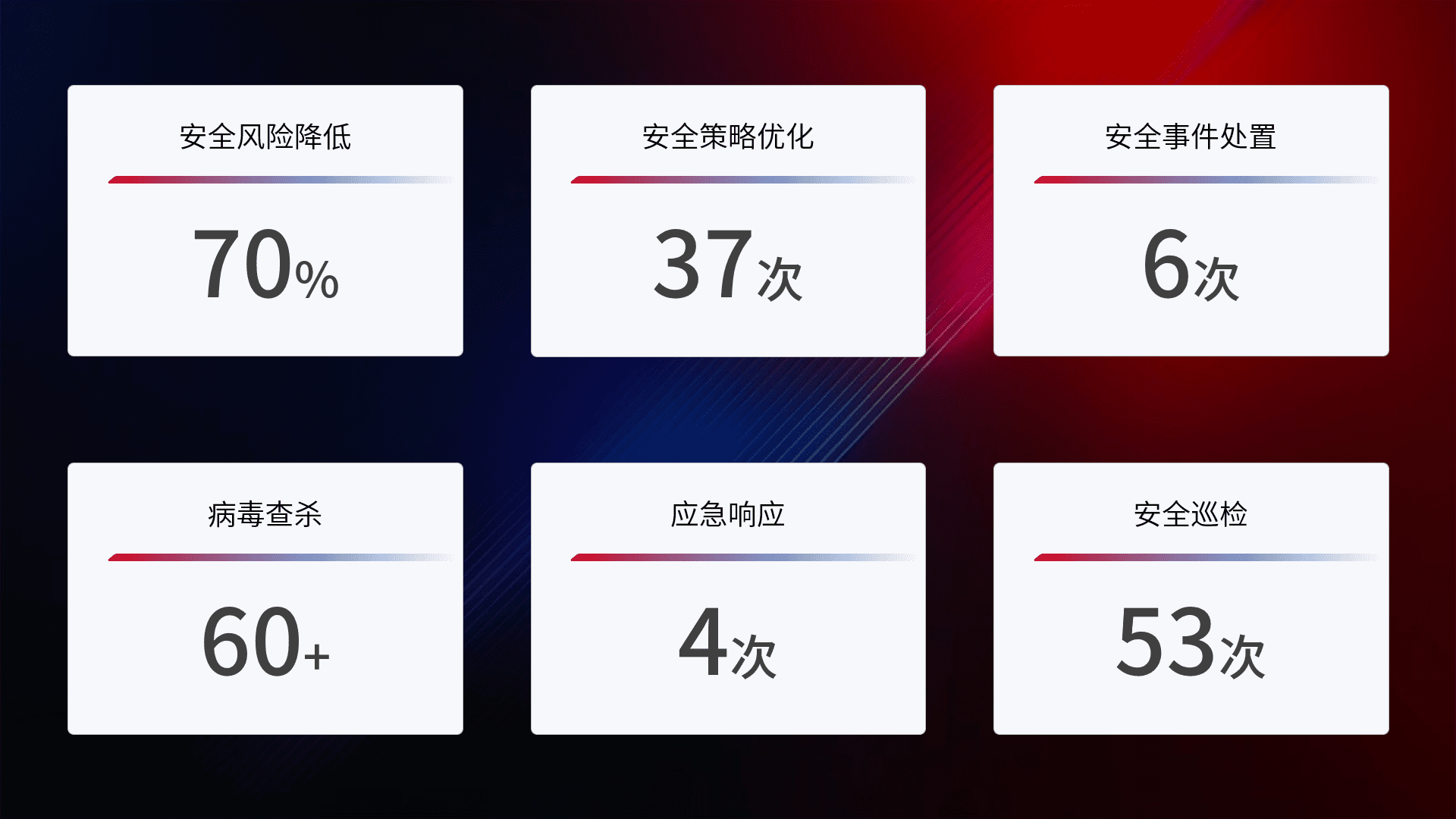 提供全面的安全事件报告体系,,,包括处置报告、、、周报、、季度和年度总结,,,结合持续监控,,,,帮助客户深入了解网络安全状况。。。