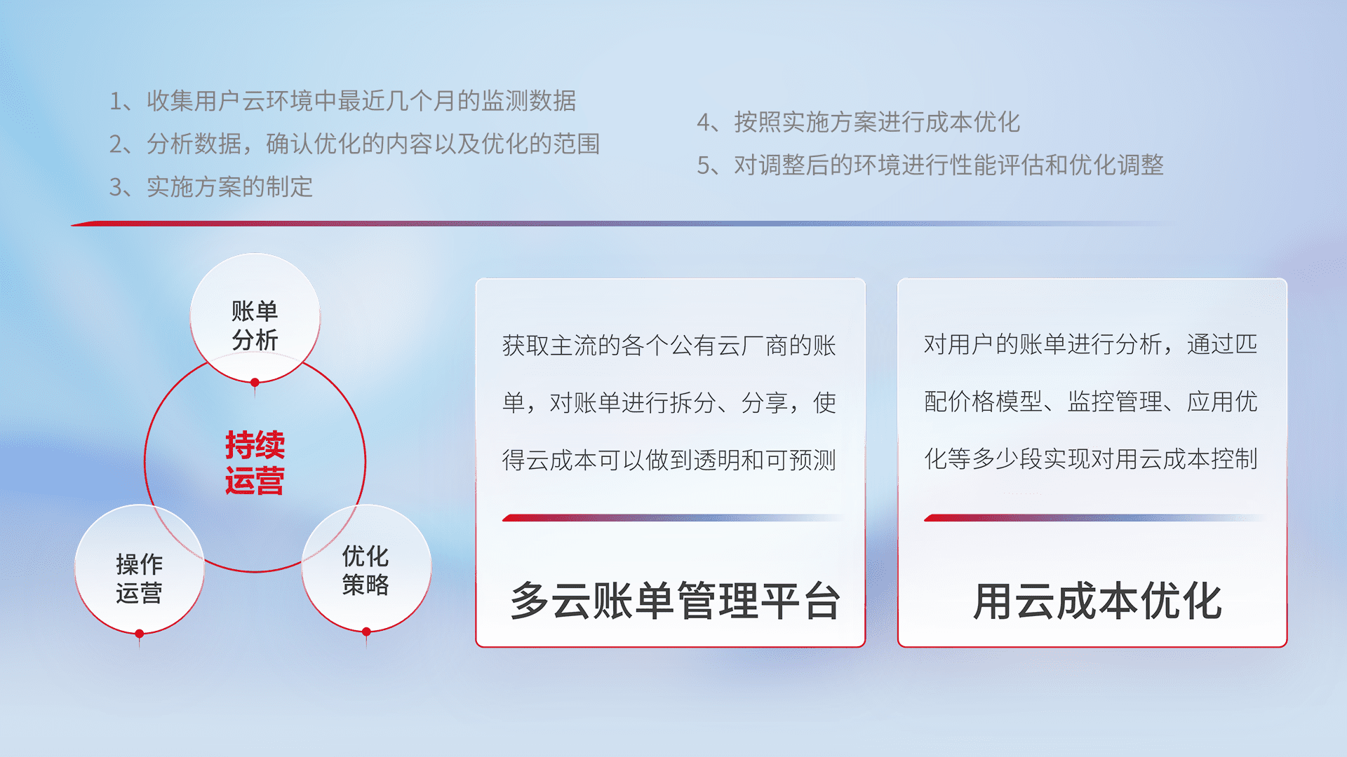 通过多云纳管,,,,以统一的资源数据模型把客户的云资源进行抽象和封装,,,进而实现对多云资源的统一操作,,保障云资源管理的可靠性、、稳定性与可用性。。。。量身定制化运维内容,,配置、、开发运维、、、、补丁管理、、、、备份、、、监控、、、、认证和访问管理、、、、审计和日常巡检等,,,保障在用云过程中的可靠度,,稳定度以及高可用率。。。